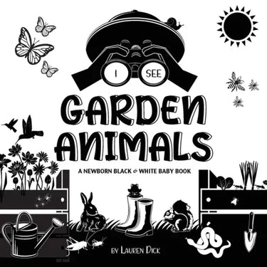 The I See Garden Animals black and white baby book introduces 20 garden creatures with playful features. Help your baby get to know hummingbird, butterfly, dragonfly, snail, bee, spider, snake, frog, mouse, rabbit, mole, and more. The high-contrast design is perfect for a baby's developing eyes, and the bold patterns will be sure to grab the little one's attention!