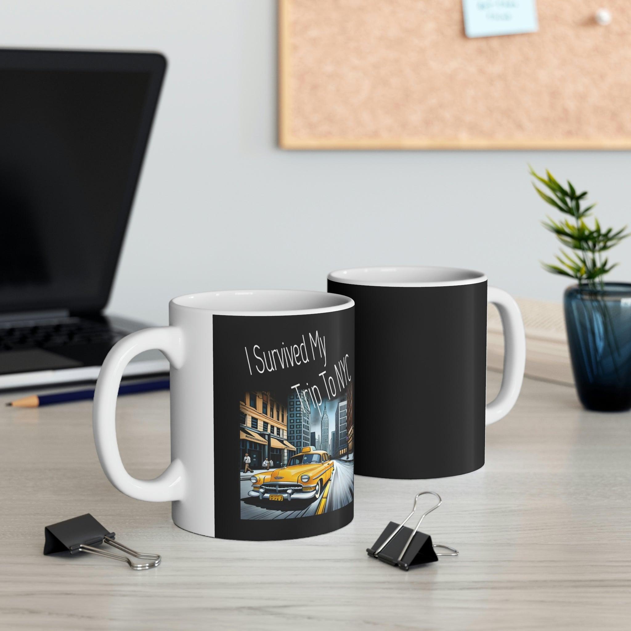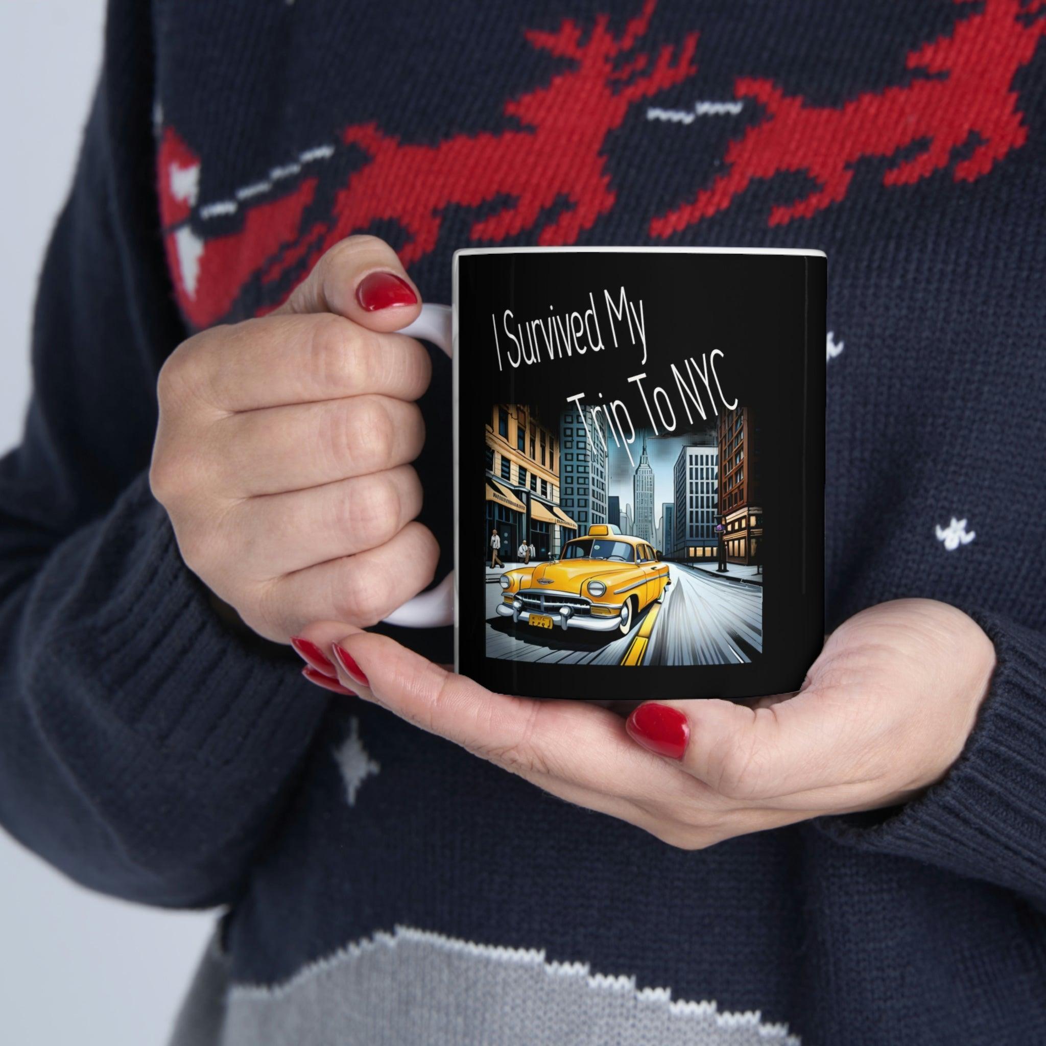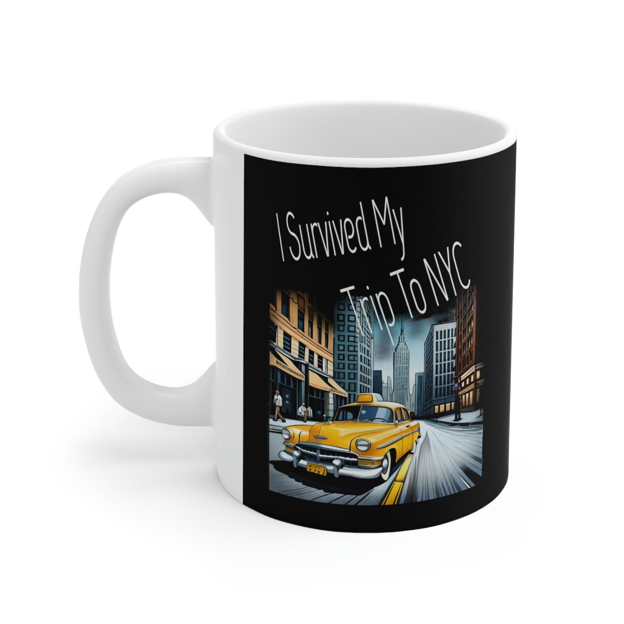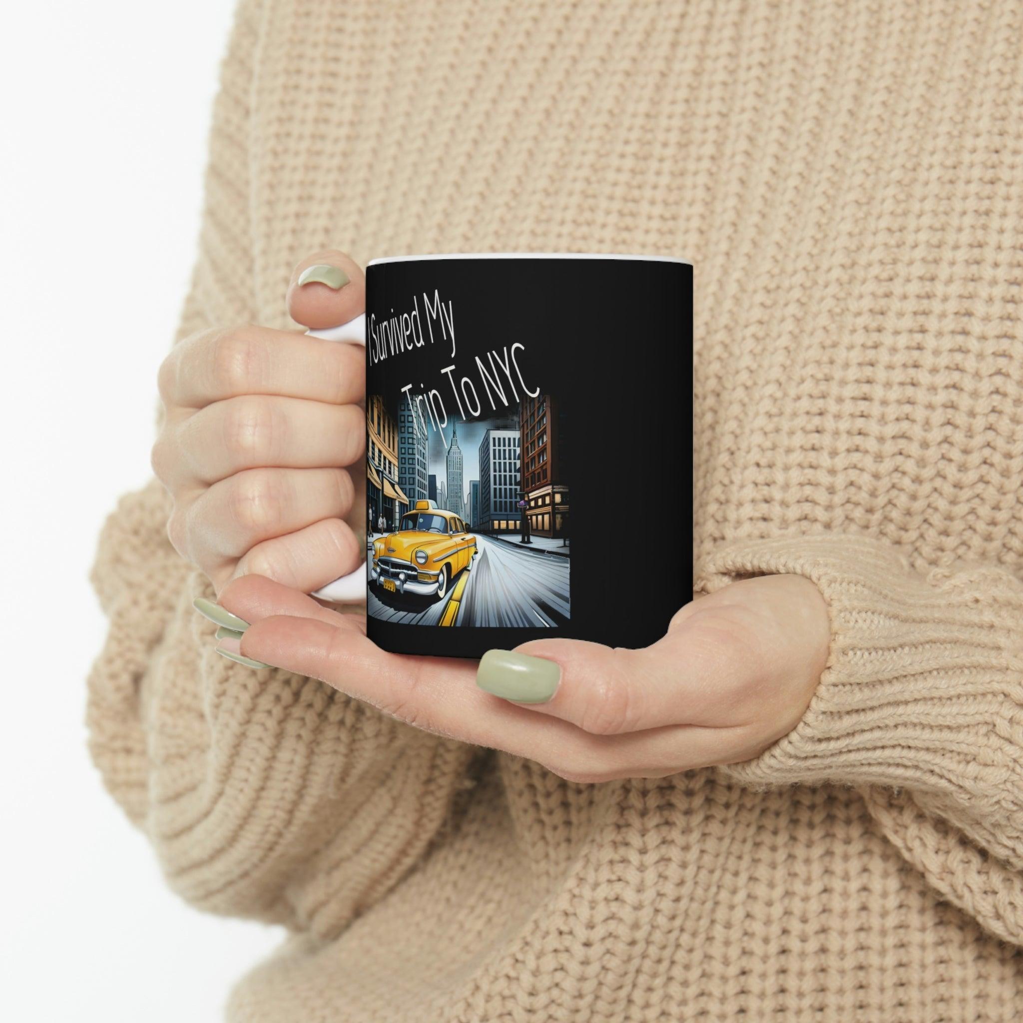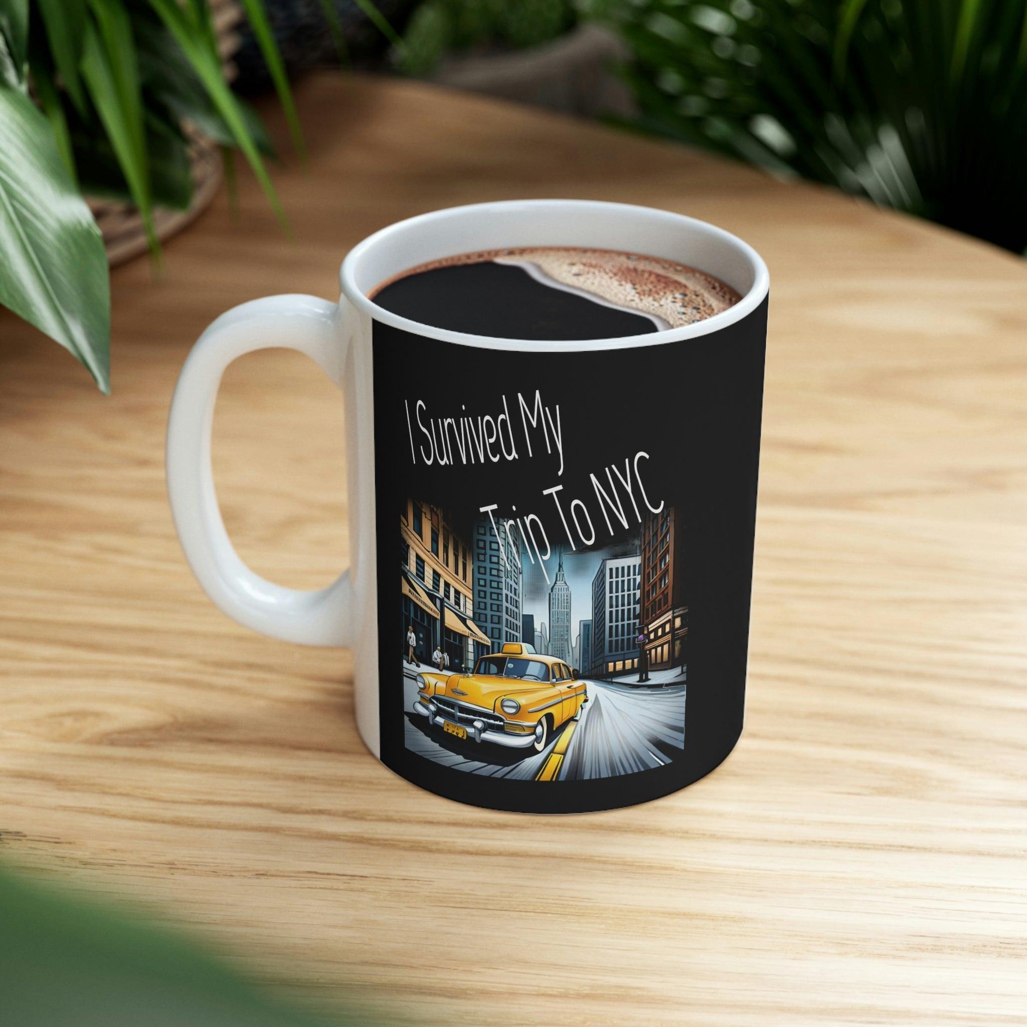his "I Survived My Trip to NYC" Mug is the perfect souvenir for anyone who has braved the hustle and bustle of New York City. Featuring iconic landmarks such as the Empire State Building, Statue of Liberty, and Times Square, this shirt is a great way to remember your trip to the Big Apple. This ceramic mug is of high-quality materials.. Whether you're a seasoned New Yorker or a first-time visitor, this mug is a must-have addition to your kitchen accesories. Use it on your next trip to the city or show off your love for NYC wherever you go. Get yours today and let everyone know that you survived your trip to the city that never sleeps!