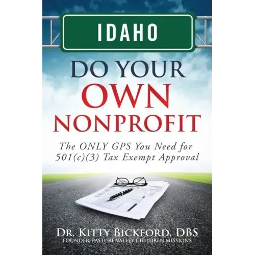 Dr. Kitty Bickford is one of the foremost experts in the country on getting tax exempt 501c3 nonprofit status. A Christian woman, teacher, speaker, author, consultant, and 10 year Air Force veteran, Kitty is happily married to her best friend, has four children, and fourteen grandchildren. She is a lifelong "extravagant cheapskate" who enjoys doing big things on small budgets. Her favorite scripture is "I can do all things through Christ who strengthens me." As a teacher, she lives by Albert Einstein's famous "if you cannot explain it simply, you don't understand it well enough." She is also the author of Nonprofit Touchdown: Winning The 501c3 Game Against IRS which covers all 50 states instead of just Idaho. You do not need both books, either will work well.