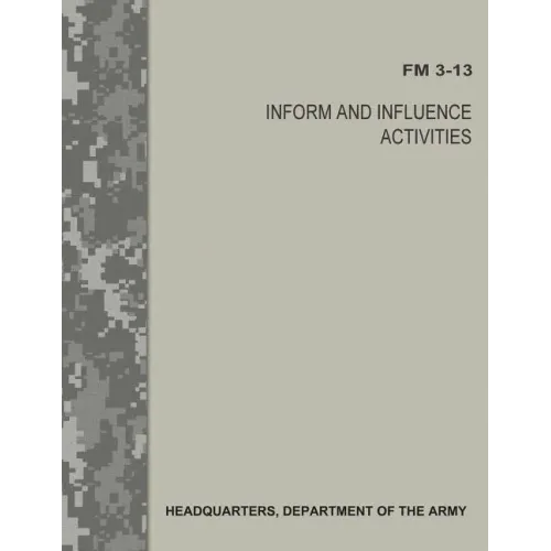 Field manual (FM) 3-13, "Inform and Influence Activities," provides doctrinal guidance and directions for conducting inform and influence activities (IIA) and discusses the importance of information in operational environments. It describes the Army's view of how IIA aid the commander to gain an advantage through information. It develops the other principles, tactics, and procedures detailed in subordinate doctrinal publications. The publication does not address every information-related capability commanders can use to help shape their complex operational environments. It should, however, generate introspection and provide just enough guidance to facilitate flexibility and innovative approaches for commanders to execute the art of command to inform and influence. It also provides guidance to the staff to conduct IIA to achieve the desired effects that support the commander's intent and objectives. Commanders designate an information-related capability and are only limited by available resources.