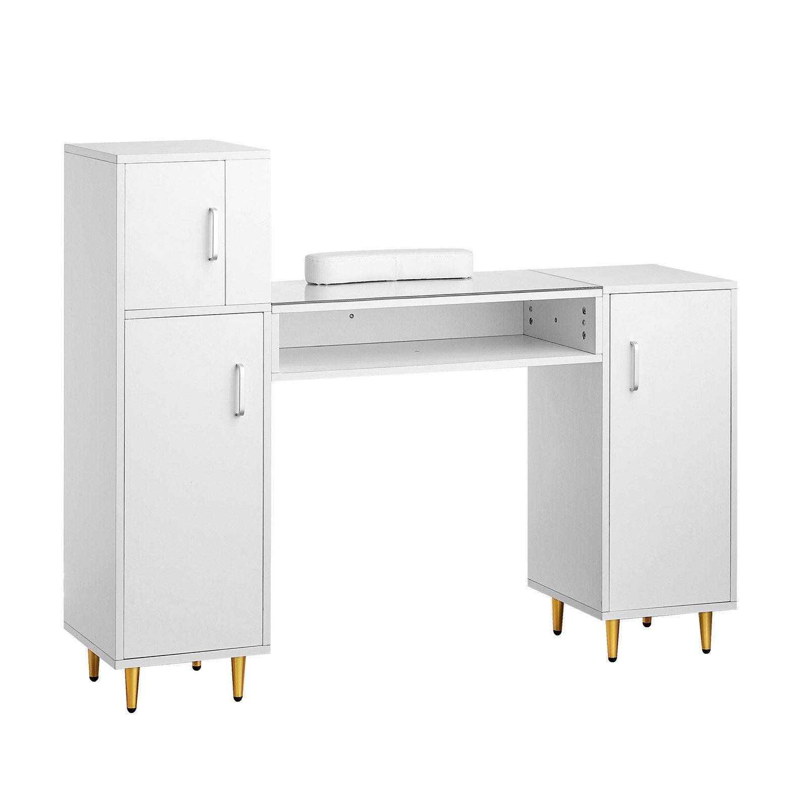 Manicure Table, Glass Top Nail Desk, Makeup Dressing Nail Station with Storage Cabinets, Acetone-Resistant Nail Tech Table for Beauty Salon Spa Workstation with 8 Metal Legs, Wrist Rest, White