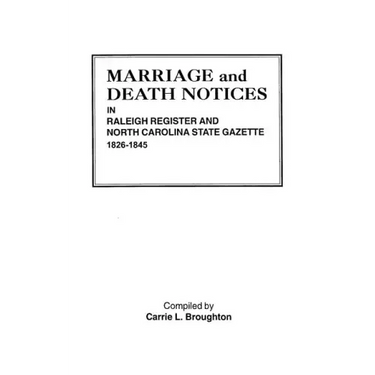 This three-part series is a valuable record of North Carolina marriages and deaths covering the entire state for the period 1799 through 1867. This 1826-1845 volume is devoted to marriages and contains about 8,000 entries under the names of both bride and groom. Part II, the deaths, contains about 4,000 entries. The information given includes full name, place of residence, date and place of marriage and death, name of newspaper, and date of publication.