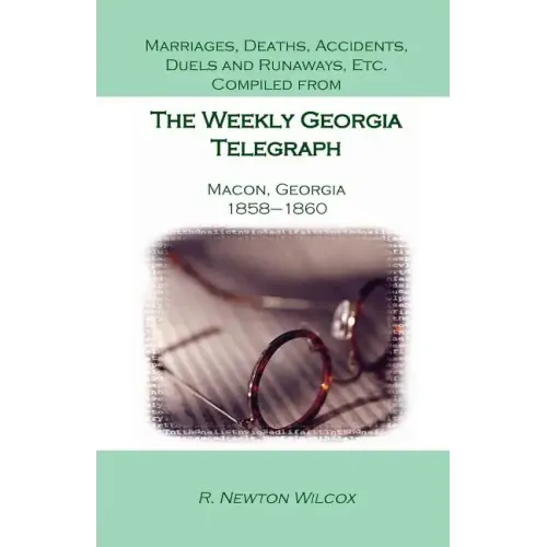 Newspaper abstracts are an excellent resource for genealogists and historians. In addition to the abundance of names and relationships, news articles tell us a lot about the customs, lifestyles, and priorities during this fascinating period-not just in Macon, Georgia, but in our county as a whole. This volume includes abstracts of articles gleaned from issues of The Weekly Georgia Telegraph from Jan. 5, 1858 to Dec. 11, 1860. Marriage notices with the names of those involved; death notices with varying amounts of biographical information; plus accounts of accidents, duels and other interesting tidbits of local concern really bring this community to life. Articles on "runaways" offer detailed physical descriptions of the missing slave and the full name of his/her owner. News of national note, and numerous articles from around the nation are included. All names are set in uppercase within the text, and a fullname index is included to facilitate research.