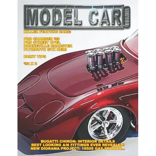 We have some really great feature cars in this issue to inspire you! Francis Laflamme's '70 Plymouth Hemi GTX has some unbelievable machine work in it! Claude Thibodeau shows us what scratch building is all about with his LSR car! And Rick Doering's Pro Street OPEL is perfection! We paint an Impala with some Glitz paint, build a pair of '32 Fords to honor a friend, Roy builds a Pro Street '55 Chevy with a Pro Charger Hemi engine! We show you the BEST looking A/N fittings on the market, and tell you where to buy rod & tubing in bulk. There's web tips from John Black, Dominick Petit, Phillip Burnette, John Strick, and Amy Whitehouse. New products include another Iceman Collections motor, diamond files, and metal decals. We do the interior in our Alpha Models Bugatti Chiron Sport. Last, but not least, we introduce a new diorama project: 1950s Route 66 Gas Station! Ya gotta check out this gas station kit from Sale Design.