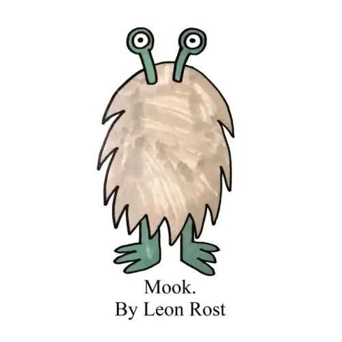 Mook is a children's book featuring a two-eyed furry monster. Mook transforms into various shapes and personas, based on the wordplay on its name. The book is intended to expand children's (and adults') imagination, by illustrating the malleable nature of our language, and the malleable nature of our identities. From Mookhamad Ali to Mooooooook to Mooklear Explosion, the book introduces various forms of wordplay and coinage, accompanied by original hand-drawn illustration.The book leaves pages at the end for the reader to invent, name, and draw their own Mook. Mook is part of a series. Mook's friends each have their own book in which they transform in unique and delightful ways.