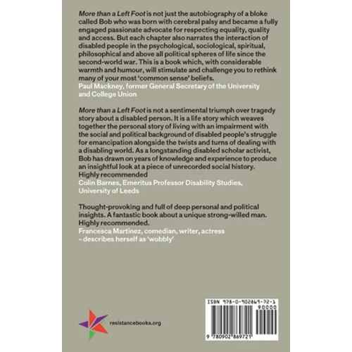 The book places the struggles for the emancipation of disabled people within the context of Bob's life journey. Born with cerebral palsy in 1951, he spent a third of his life in segregated education. But he was to go on and influence both theory and practice in many differing arenas, becoming a student leader and a scholar activist.Bob traces his experience of life, discrimination and political awakening both as an individual and as part of a specific social group. This journey links disability politics to a wider politics within students, disabled peoples, trade union and labour movements. The book concludes with sober commentary of the on-going struggle against disablement and capitalism.