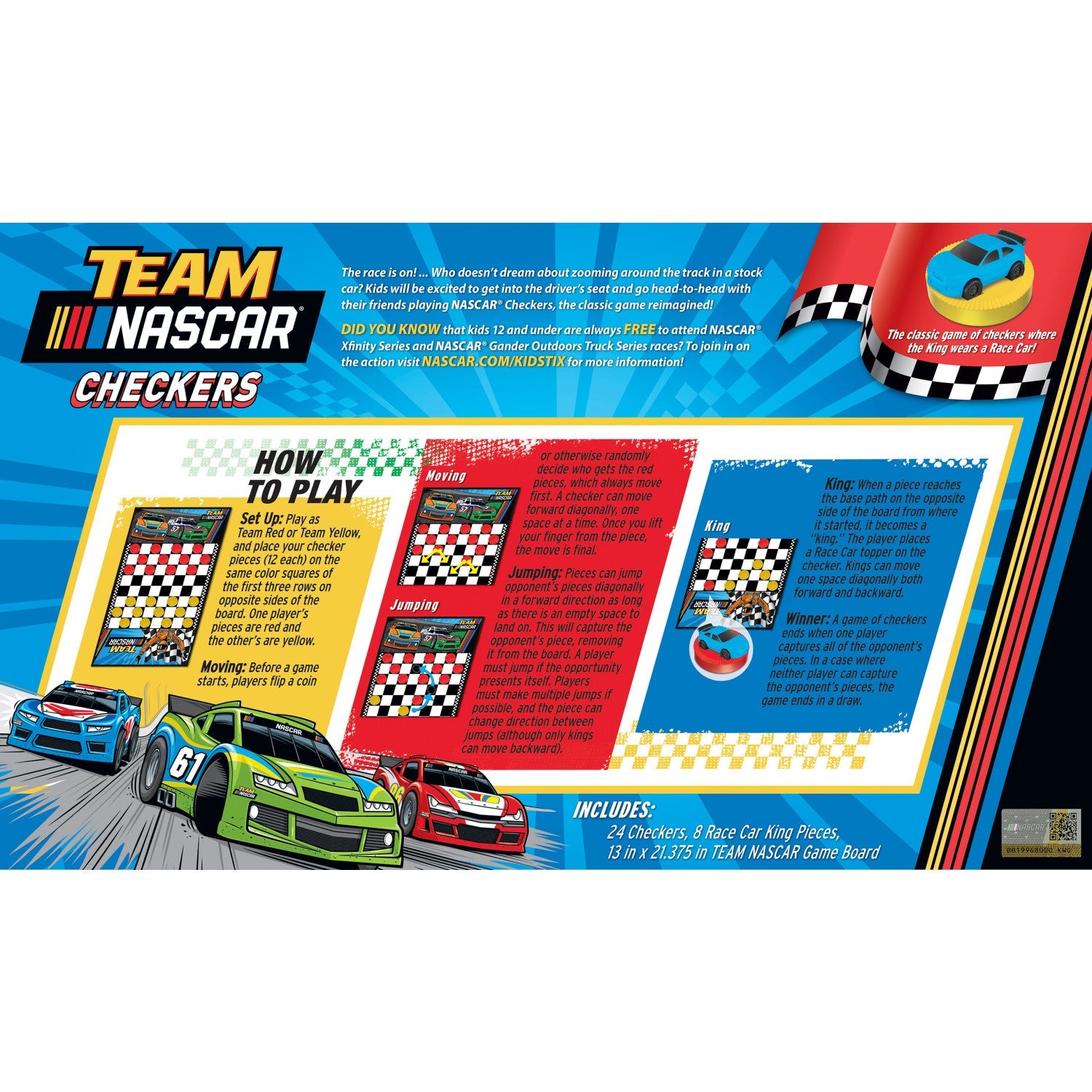 If you're a fan of NASCAR, then you're going to love this officially licensed MasterPieces NASCAR Checkers Board Game. This classic game of checkers is a ton of fun for children and adults ages 6 and up, and it's a great way to show your NASCAR pride. This checkers game comes with 24 checkers pieces, 8 race car king pieces and 13 inch x 21 inch game board, 1 sticker sheet, and an instruction sheet. So get ready to put your skills to the test and crown yourself the checkers champion!Free shipping on all U.S. orders