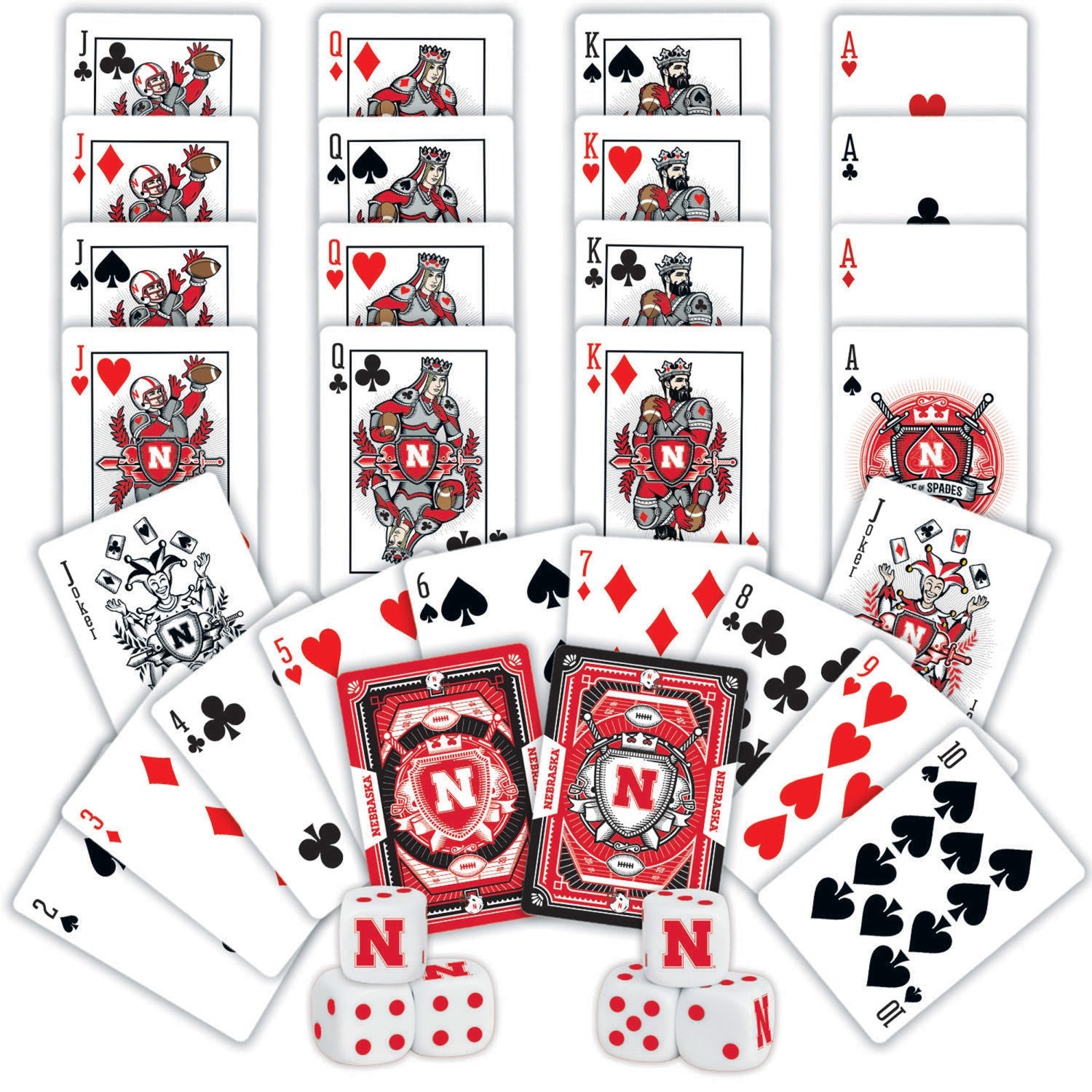 Who says you can't bring the casino to your next game night? These Officially Licensed NCAA Nebraska Cornhuskers 2-pack playing card and dice sets are perfect for any game night. The high-quality Casino Style Cardstock playing cards are perfect for any fan of the Nebraska Cornhuskers. The deck features a unique team design and comes with a 6-piece 16mm D6 gaming dice set. Whether you're playing some poker or trying to beat the dealer at blackjack, these cards will help you do it in style. So roll the dice and get ready to bet big, because, with this set, you're going to win big. Go Team!Free shipping on all U.S. orders