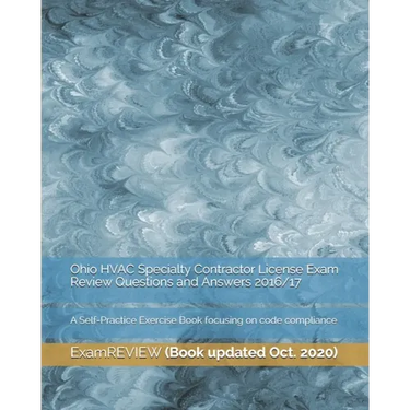 Book updated Jul. 2022. We create these self-practice test questions module (with 150+ questions) referencing both the requirements set forth in the adopted IMC as well as some Ohio specific information currently valid in the HVAC trade (plus a bit of knowledge on electrical works as many appliances are electric powered). Each question comes with an answer and a short explanation which aids you in seeking further study information. For purpose of exam readiness drilling, this product includes questions that have varying numbers of choices. Some have 2 while some have 6 or 7. We want to make sure these questions are tough enough to really test your readiness and draw your focus to the weak areas. You should use this product together with other study resources for the best possible exam prep coverage.
