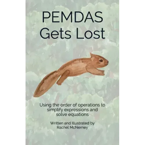 A young squirrel named PEMDAS decides math is a silly game to play. But once he gets lost in the woods, a new friend shows him it can be fun to follow the steps back home. Written by a certified middle school math teacher, "Math Is Nuts" books read like entertaining children's stories, rather than educational texts. Each step to solving a math problem is illustrated simply and clearly, with the abstract numbers and operations facing whimsical watercolor characters and a plot to make the problem meaningful and memorable. The text is suitable for older children to read independently, but it is also great for parents, grandparents, teachers, and mentors to read and talk about with children of any age. "PEMDAS Gets Lost" focuses on using the order of operations to both simplify multi-step expressions and to solve equations. These skills are generally taught in the middle school grades. Only whole numbers and an exponent of two (squaring) are used to target the order of operations skills. Fractions, decimals, and more exponents can be found in other books of this series coming soon