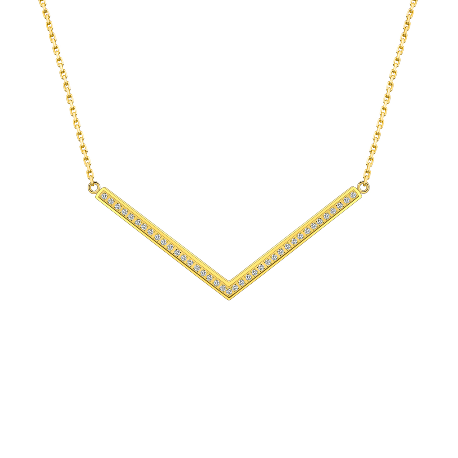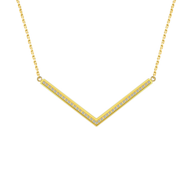 This is a pendant with a "V" shape that is lined with 39 .02 ct B.Tiff Diamond Alternative stones. The "V" shape seemingly provides sleek organic lines with two rows of highly reflective stones that will sparkle even under the dimmest light.