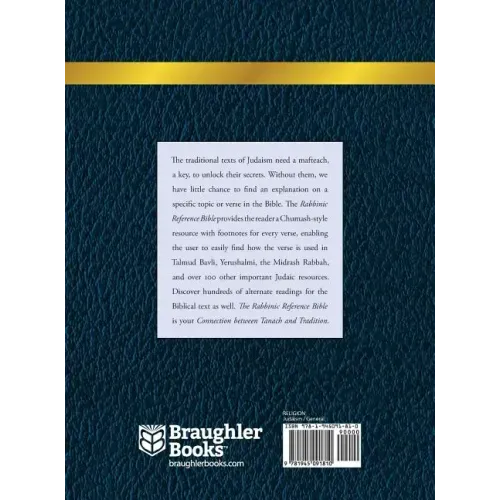 The traditional texts of Judaism need a mafteach, a key, to unlock their secrets. Without them, we have little chance to find an explanation on a specific topic or verse in the Bible. The Rabbinic Reference Bible provides the reader a Chumash-style resource with footnotes for every verse, enabling the user to easily find how the verse is used in Talmud Bavli, Yerushalmi, the Midrash Rabbah, and over 100 other important Judaic resources. Discover hundred of alternate readings for the Biblical text as well.