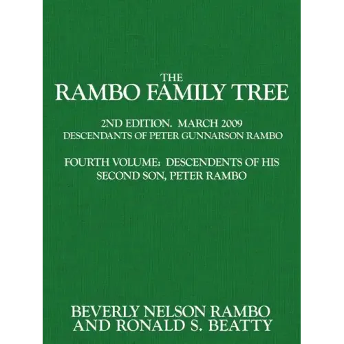 Nearly all of the Rambo families in the United States are descended from one common ancestor: Peter Gunnarson Rambo, a Swedish colonist who landed on the shores of the Delaware River in 1640 at what is now Wilmington, Delaware. This history of the Rambo family describes Peter and his six children and lists their descendants who have migrated into every state of the Union. Some of the family lines have been extended to the 12th generation with their children comprising the 13th generation. Peter Rambo, Peter Gunnarson Rambo's second son, and his descendants are the focus of this fourth volume of the Rambo Family Tree series. Peter was an active member of Gloria Dei Church, became a large landowner, and was a representative of Philadelphia to the Pennsylvania Assembly in 1709. Peter and wife Magdalena Skute lived on Pennypack Creek in Lower Dublin Township now part of Philadelphia]. This volume lists all their children and many generations of descendants although generally no people still living will be recorded herein. Rambo is the primary surname in this book although extended families are recorded by daughters who married Davis, Johnson, Kiger, Roof, Runyan, and Smith husbands. A third edition of this genealogy is being compiled as you read this. Please help to improve this genealogy by sending corrections, additions and improvements to me at rsbeatty@gmail.com. With your help, the third edition can be even better. Thanks. Ron Beatty, October 2009