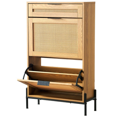 Rattan Shoe Cabinet, Narrow Shoe Storage Organizer with 2 Flip Rattan Drawers & 1 Slide Drawer, Metal Legs, Slim Shoe Entryway Cabinet Ideal for Entryway, Closet, Hallway, Light Wood Color