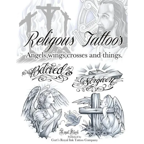 Religious tattoos.This is from Internationally Published, Award winning New York based Tattoo artist Cort Bengtson Of Cort's Royal Ink Tattoo Company and Royal Flash.This book is 8.5" x 11" and contains over 300 tattoos of religious symblols like angels, crosses, Jesus, Mary, and In memory tattoos and many many more. They range from full bright color to biker style black and gray. These tattoos have already been distributed the world over and proven money makers for any tattoo shop doing walk in everyday type tattoos.Do just one tattoo and double or triple your money Over 20 pages of plain to stunningly detailed crosses alone
