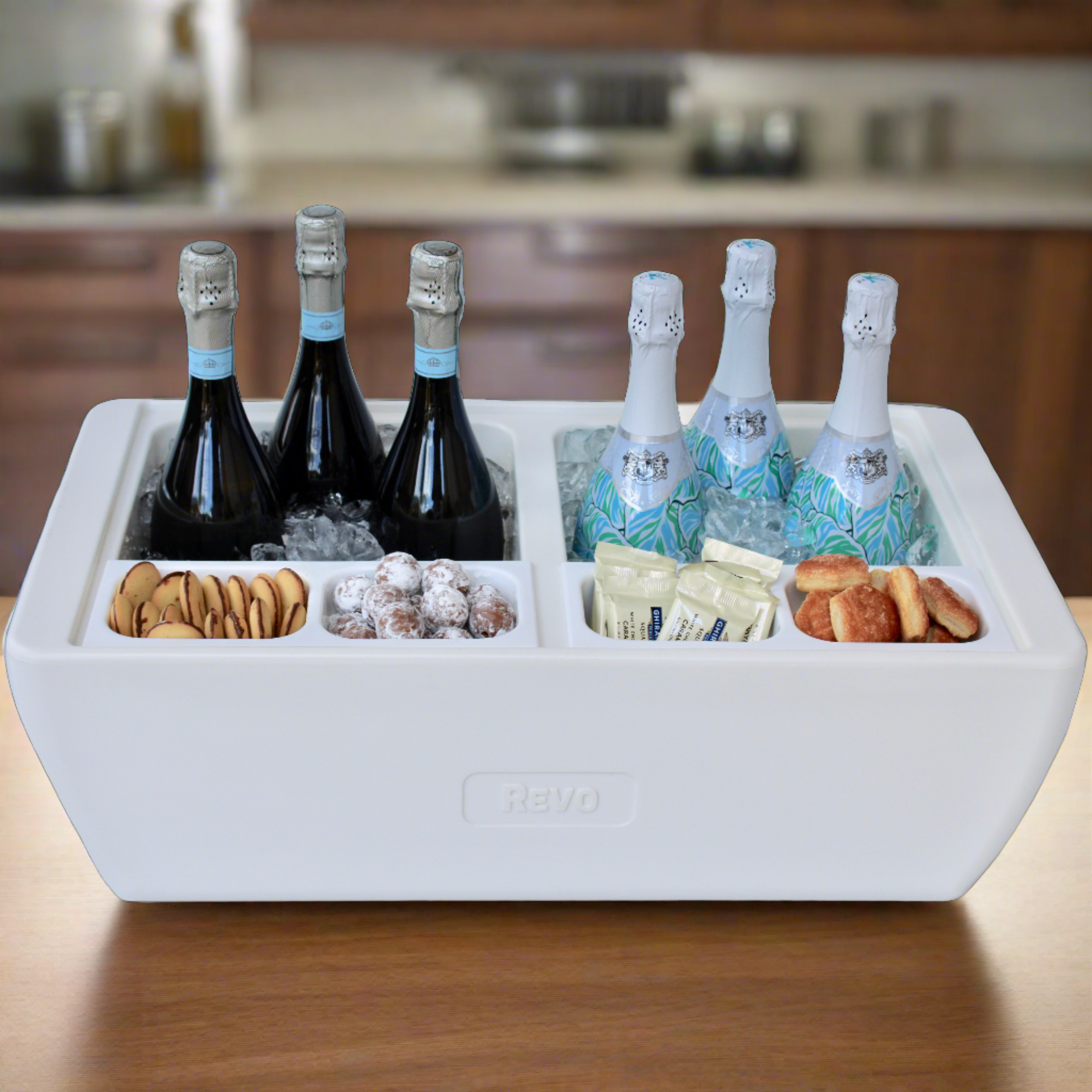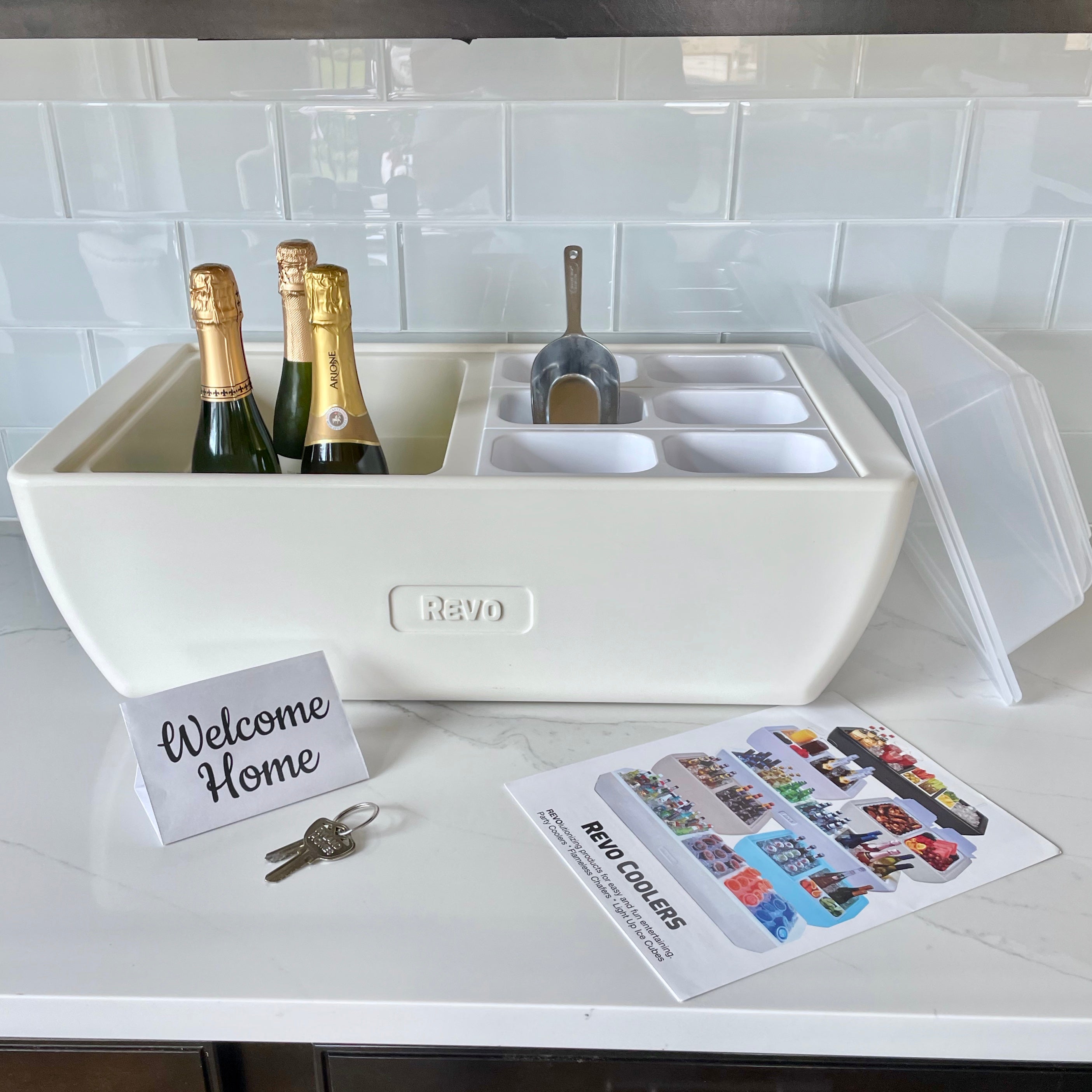 The Dubler is a fun and incredibly versatile party cooler with premium insulation. Beverage displays are visible and easily accessed without digging through ice. An ice scoop is included for use as an ice bucket and the condiment trays provide plenty of display options. Each compartment fits a 1/2 size food pan and it also comes with 2 lids. From mimosa bars to taco bars, guests will love the inviting presentation. Premium insulation means no condensation mess and it can be used indoors or outdoors. It can also be used with chill boards or with heat packs as a flameless chafer, making it the most versatile party cooler for all events. It’s the “Swiss Army Knife of coolers”.