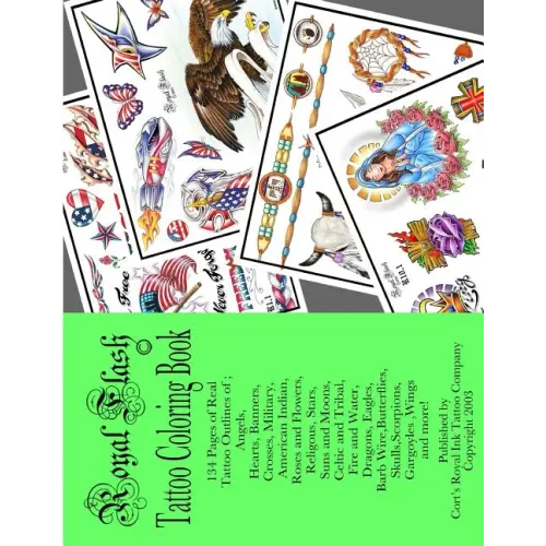 Royal Flash Tattoo Coloring Book 133 pages of Real Tattoos from "The First 201" Royal FlashThis is from Internationally Published, Award winning New York based Tattoo artist Cort Bengtson Of Cort's Royal Ink Tattoo Company and Royal Flash.Here is133 Pages of Real Tattoo Outlines of; Angels, Hearts, Banners, Crosses, Military, American Indian, Roses and Flowers, Religous, Stars, Suns and Moons, Celtic and Tribal, Fire and Water, Dragons, Eagles, Barb Wire, Butterflies, Skulls, Scorpions, Gargoyles, Wingsand more Printed one sided (so there is no bleed through to the other side, although I recommend using a barrier sheet of paper between pages if using markers). Over 1000 designs This is from the early 2000 period and originally sold in all 50 states and 10 countries. So you are coloring real tattoos This is from someone tattooing over 20 years who knows what people have asked for and gotten. Now times have changed and so have requests too but there are somethings most people always start with and here it is. Nothing cheap here, great designs, great paper great cover, great book