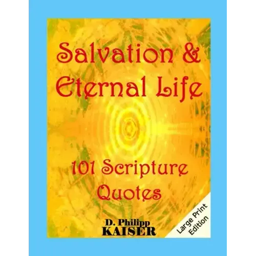 This Edition of SALVATION & ETERNAL LIFE is a Large Print Book (APHont 18) specifically designed for low vision readers. A while back, while meditating about God, I wanted to read more in the Scripture about Salvation and Eternal Life. I built this collection of 101 Scripture Quotes so that I could easily find, read and meditate on one each day, and if you use it that way, it will cover 101 days... I would then just start over again, but use it as works best for you. I have added my thoughts about what each Scripture quote means to me; they are only notes to me and ignore them if you want, as my words may not correctly get the Lord's messages across. Freely use whatever you want, and then pray. Thank God, but not me as I am only a channel for our Lord. I am at best only a very small and feeble beam of light pointing the way towards the Light of Christ... Copy and share this book with anyone to spread God's Word and His Kingdom. Remember, Choose God each and every day, for to Choose is Worship, and Worship is Love, and our unconditional Love is what our God always wants most from us. More at www.DarrelKaiserBooks.com