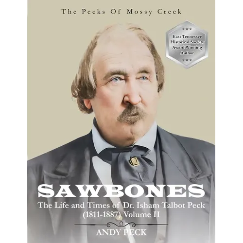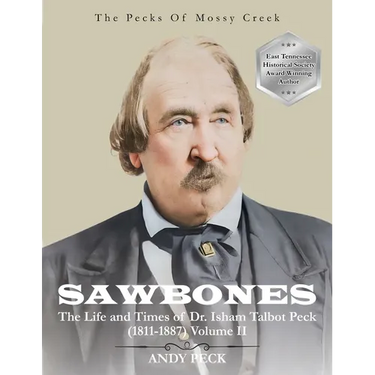 Between 1874 and 1886, Dr. Isham Peck (Ada and Charley's father, and grandson of Adam Peck, Sr., founder of Mossy Creek) wrote letters to the editor of The Morristown Gazette under the pen name Sawbones, and people wrote to him as well. Sawbones takes you on a deep dive into life in East Tennessee, Vicksburg, and Northeastern Louisiana during the years of Reconstruction after the Civil War and beyond. Sawbones expresses his thoughts on politics, slavery, medicine, agriculture, church disputes, friendship, and fishing. In Volume I Author Andy Peck includes the history of Isham Peck and family, including what is known about his pre-Civil War service in the U.S. Army as a surgeon during the Black Hawk and Mexican-American Wars. Volume II covers the final 18 articles and extensive Mossy Creek history and geography. Allow yourself to be transported to the South as the author includes original photography and a series of videos from places where Isham and family lived. Scan QR codes throughout the book to watch and learn! Sawbones is a journey worth experiencing!
