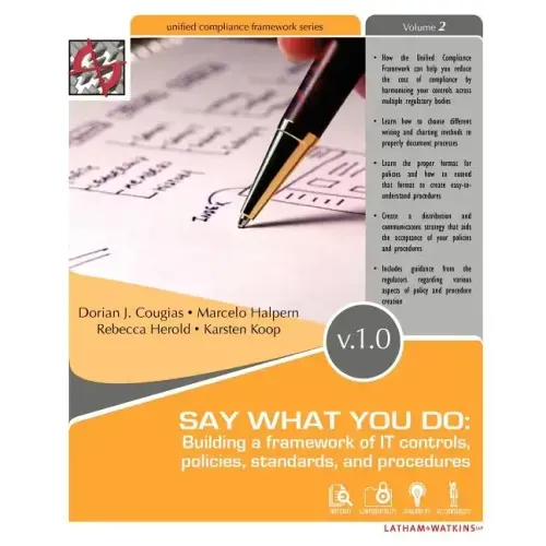 Say What You Do: Building a framework of IT controls, policies, standards, and procedures is the definitive guide to process documentation. Written by an all-star team of award winning writers, internationally acclaimed lawyers and IT auditors, Say What You Do walks the reader through all of the steps necessary for creating a compliance-driven IT controls framework, policies, standards, and procedures. Included are techniques for solid writing, editing, and policy, standard, and procedure dissemination.
