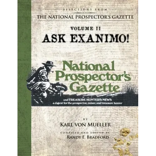 Selections From The National Prospector's Gazette VOLUME II: ASK EXANIMO Famed treasure hunter, author and publisher Karl von Mueller reintroduced the treasure hunting community to the "National Prospectors Gazette" in 1969. For nearly 15 years, the NPG provided a constant source of education and entertainment to eager subscribers. "Ask Exanimo " is the second in a series of books where information from the NPG is reprinted for the first time in 35 years. Select articles and columns are being presented for a new generation of treasure hunting enthusiasts. Presented here is Karl von Mueller's question and answer column, spanning 15 years and covering a wide assortment of topics from metal detecting, to prospecting, self-reliance, treasure stories, Western History and much more. One of the original columns to appear in the NPG and lasting throughout its print run, Karl von Mueller shares his thoughts, opinions and most importantly his encyclopedic knowledge. The NPG demonstrates the timeless quality of Karl von Mueller's writing, every bit as relevant now as it was when first published. Like Karl von Mueller's Treasure Hunter Manuals, the NPG captivated readers and now the NPG is made available to a 21st Century audience.