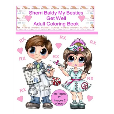 25 images 2 of each for a total of 50 fun coloring pages. Theme for this book is RX Get Well Nurses and Doctors Sherri Baldy's NEW SUPER ADORABLE My Besties "GET WELL" Coloring Book We are so excited to be Introducing our Oh So FUN My Besties Coloring Book just for you by Sherri Baldy. Her Coloring books are perfect for Adults and children of all ages You will find that All Of Sherri's Books are created to help you Relax, Unwind & Enjoy coloring So get Creative With Sherri Baldy & Her My Besties Art This coloring book is filled with RX Get Well Besties These Super Cute and easy to color coloring books are filled with her Fun Big Eyed Lovable Besties, they are great coloring FUN for all ages at any time of the year. They are a perfect Coloring Therapy that takes you away to a COLORFUL HAPPY PLACE This Big Eyed Bestie collection is from Sherri's "Original" My Besties TM Art & Illustrations..... Sherri is a world renowned artist for over 30 years Sherri's My Besties art & images have been collected and loved by Coloring Book Enthusiasts, Stamper's, Crafter's, Scrapbooker's and more...My Besties have been fans favorites all over the world for years and are now available in coloring books Just for you. What You get in Sherri's Coloring Book are One image per page that you can color with any medium you like, Colored Pencils, Crayons, Pastels and even markers if you back each page with card stock so it will not bleed through Page size: Each page is 8.5 x 11 Number of images: You get 25 images 2 of each SO....You get *50* coloring pages each image is printed single sided so you can frame or give away your colorful Bestie creations. Order YOURS TODAY from the order button above and start to Color, Relax & Enjoy Most of all have FUN you can find out MORE about the artist here: www.MyBestiesShop.com in about the artist Thank you so much "From My Art Table To Yours" XOXO Sherri