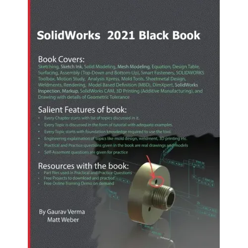 The SolidWorks 2021 Black Book is the 8th edition of our series on SolidWorks. With lots of additions and thorough review, we present a book to help professionals as well as learners in creating some of the most complex solid models. The book follows a step by step methodology. In this book, we have tried to give real-world examples with real challenges in designing. We have tried to reduce the gap between university use of SolidWorks and industrial use of SolidWorks. In this edition of book, we have included many new features of SolidWorks like Sketch Ink, Silhouette Entities, 3D Textures, Mesh Modeling, DriveWorksXpress, Markup, SolidWorks Inspection, and so on. New practice questions have been added in this edition. The book covers almost all the information required by a learner to master the SolidWorks. The book starts with sketching and ends at advanced topics like Mold Design, Sheetmetal, Weldment, SolidWorks CAM, Rendering, and MBD.
