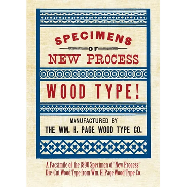 Specimens of New Process Wood Type! was issued by the William H. Page Wood Type Company in 1890. The development of die-cut "new process wood type" was a response to competition from J. E. Hamilton's veneer Holly Wood Type, which was sold at a much lower cost than Page's traditional wood type cut by pantograph in end-grain maple. The "new process" proved to be short lived, because one year after this specimen was published William Page sold his wood type company to Hamilton in 1891. Hamilton incorporated all of Page's designs and equipment, and continued to sell the die-cut type until 1906, and the borders into the 1940s. This is the only specimen that shows all of Page's die-cut wood type and border designs.
