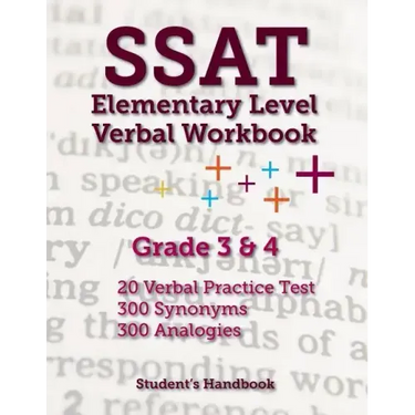 SSAT Elementary Grade 3 and 4, Verbal Workbook. This booklet contains twenty practice tests for those looking to take the SSAT Elementary Lower Level tests. 20 practice tests, exactly formatted to match the 2018 and 2019 edition of the SSAT, with 300 synonyms and 300 analogies.