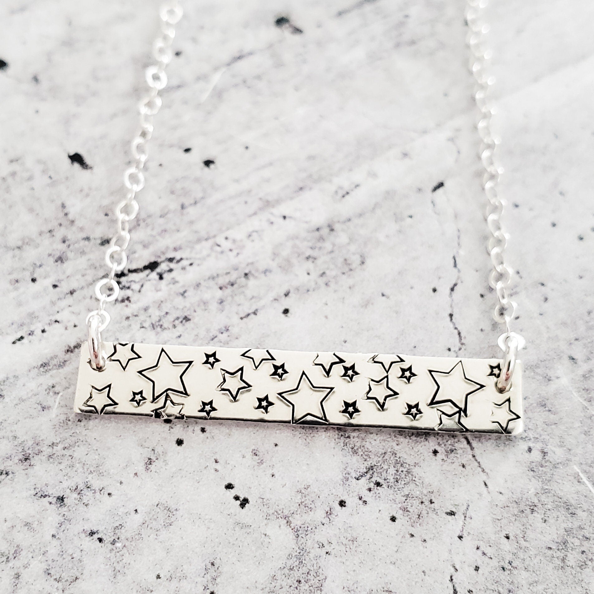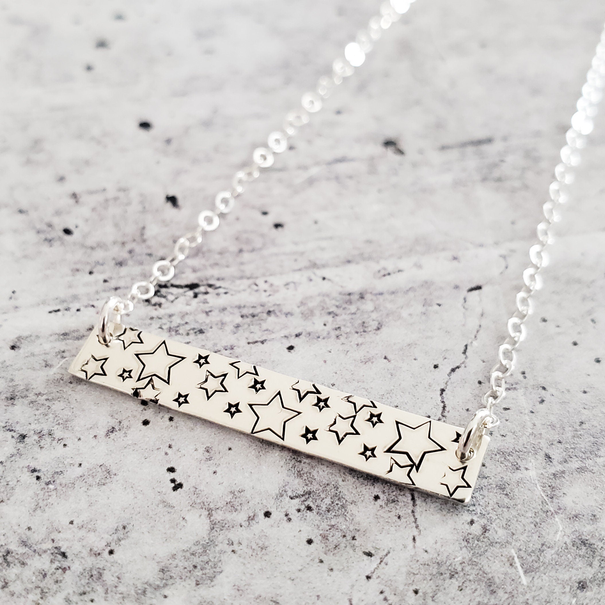 This chic shiny bar necklace is hand-stamped with different sizes of simple stars. It's a classic, understated accessory to dress up any outfit, be it your daily fashion or the occasional glam look.