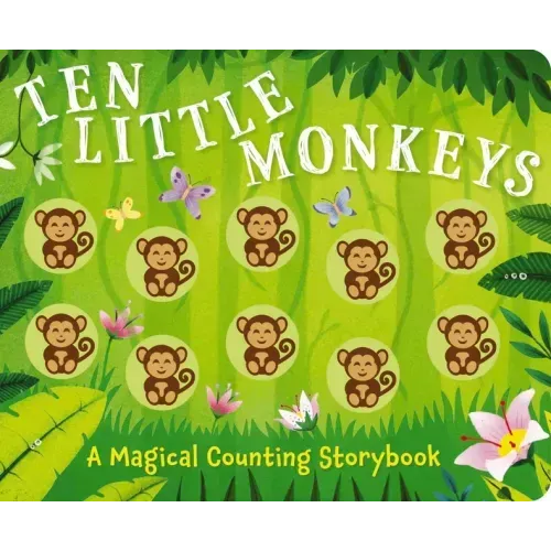 Ten little monkeys swinging on a vine, along came a lemur and then there were...nine! Learning to count has never been more fun. This unique board book counts from ten little monkeys all the way down to one with adorable illustrations of monkeys and other animal friends in the jungle. With each page, one more monkey disappears. To help demonstrate this concept, this book uses tactile monkey buttons to help children count how many monkeys are left as the story progresses. Follow along with the easy rhythm and rhyme of this story and let your child touch the colorful, built-in monkey toys to give a creative and engaging hands-on approach to counting. Start young ones on a lifetime of loving reading and learning with Ten Little Monkeys.