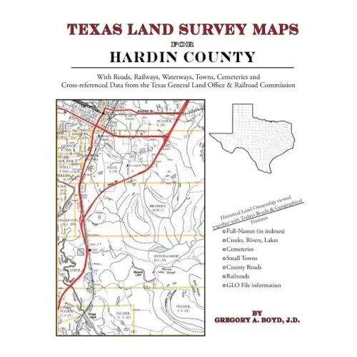 174 pages with 53 maps An indispensable book for any researcher interested in Hardin County's history or land (or both), or its first landowners after Texas's Independence from Mexico. Each book in this series is laid out into multiple maps using a 6 mile high by 4 mile wide grid.This book contains 48 Survey maps laid out within this grid. Each Land Survey Map shows the boundaries of original parcels laid out over existing roads, railroads, waterways. These are shown as well as the original Survey-Name and the Abstract Number assigned by the Texas General Land Office to the instrument that gave ownership to that parcel. Here are a number of details about our Hardin County book . . . Supplemental Maps Included (in addition to the primary Survey Maps) . . . - Where Hardin County Lies Within the State (Map A) - Hardin County and its Surrounding Counties (Map B) - An Index Map showing where each of the Land Survey Maps are within Hardin County (Map C) - An Index Map that builds upon Map C and shows the community-center points in relationship to the county-grid (Map D) - An Index Map that builds upon Map C and shows cemeteries listed in the USGS database in relationship to the county-grid (Map E) Primary Indexes (apart from each Survey-Map's own index of survey-names) - An All-Name Index (alphabetical by last-name) for every person mentioned in the maps, utilizing both Texas General Land Office and Texas Railroad Commission data. - The Abstract Listing: this is where you find the real details behind each parcel of land.Items are listed by Abstract Number What Cities and Towns are in Hardin County, Texas (and in this book)? Batson, Bragg, Dies, Fletcher, Fresenius, Gore Landing, Grayburg, Hathaway, Honey Island, Kountze, Lelavale, Lillard, Loeb, Lumberton, Nona, Pine Ridge, Pinewood Estates, Rattlesnake Bead, Rose Hill Acres, Saratoga, Seth, Silsbee, Sour Lake, Strain, Thicket, Village Mills, Votaw, Wildwood, Woodcrest Acres