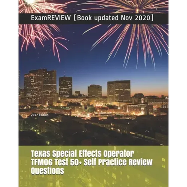 Book updated Nov 2020. This product provides material that covers the Texas Special Effects Operator TFM06 Test. We create these self-practice test questions module referencing the principles and concepts currently valid in the fireworks profession. They are for reinforcing learning, NOT for simulating "real" questions. Each question comes with an answer and a short explanation which aids you in seeking further study information. For purpose of exam readiness drilling, this product includes questions that have varying numbers of choices. Some have 2 while some have 5 or 6. We want to make sure these questions are tough enough to really test your readiness and draw your focus to the weak areas. You should use this product together with other study resources for the best possible exam prep coverage.