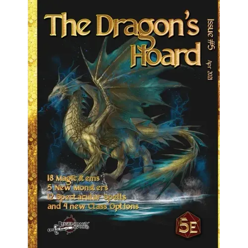 Magic, Monsters, and More! The Dragon's Hoard is a monthly anthology of magic items, spells, monsters, and more for your 5th Edition campaign! Each issue of The Dragon's Hoard takes every new magic item, spell, monster, or other new rules content from our ongoing Legendary Loot Patreon (https: //www.patreon.com/LegendaryLoot) and presents it for you, with dozens of new elements beautifully illustrated and ready to unleash on your players! In this month's features you'll find: - The Treasure Trove, featuring magnificent magic items like the ring of truth, rod of the moon, dryad's wreath, and white peacock crown! - Basker's Books, featuring new spells for almost every 5E spellcaster like flood tide, colossus, dagger of deception, and dirge of the victorious knights! - Class Acts, featuring new class options for your 5E heroes like the Norn and Nereid Sorcerer and Unicorn Charger! - Marvelous Monsters, featuring killer creatures across every challenge level like the ioun wyrd, gold golem, and the titanic kaiju King Mogaru! Join the Legendary Loot Patreon to get brand-new 5E rules content every single day plus other amazing benefits, or pick up The Dragon's Hoard every month and get 26 pages of terrific treasures, terrifying foes, and more to Make Your Game Legendary!