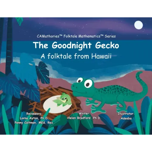 A little gecko surprises his mother by telling her that there are five reasons why he does not like the night: he hears creaking noises; a strange whooshing sound; there is a huge bright circle in the sky; chirping all around him; and, he does not want to be alone. His mother helps him patiently to understand and change how he feels. Practice counting one less than from five to zero together as the little gecko runs out of reasons one by one and, finally, goes to sleep."The Goodnight Gecko" is the third of the three books in series 4 of the CAMathoriesTM Folktale MathematicsTM curriculum (one more and one less 0 - 5) for children aged 3-4 years old. "The Goodnight Gecko" is a folktale from Hawaii. Readers will learn to count one less from five to zero as the little gecko runs out of reasons as to why he should stay awake at night, and falls softly and happily to sleep.