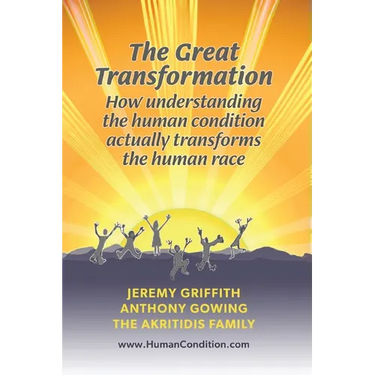 Well, what is so incredibly wonderful is that at the eleventh hour, humanity's whole heroic journey of conscious thought and enquiry has finally led to the finding by Australian biologist Jeremy Griffith of that holy grail of insights of the redeeming and healing understanding of our corrupted condition! HOWEVER, humanity is not yet in the clear-we still have to apply that understanding of the human condition to save ourselves from the near terminal levels of psychosis crippling the human race. What Jeremy Griffith and others present in this book/video is HOW that redeeming understanding IS able to save the human race by immediately transforming the life of every human from an unbearably human-condition-stricken existence to one that is effectively free of the human condition!