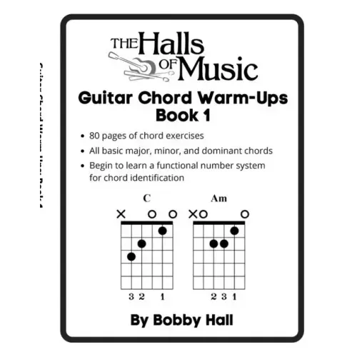 All of Bobby Hall's books are full of exercises for guitarists to play. This book contains exercises that outline the common chords in the open position including all simple major, minor, and dominant chords. Each set of exercises features a new chord and gives the aspiring guitarist a chance to play the chord in a context that features how that specific chord sounds and how that specific chord relates to other easy, beginner chords. The definition of each chord is included in each exercise. A beginning can be made in this book for understanding a functional number system for chords. Number systems related to chords are common throughout all genres of music. The Nashville numbers system is used in Nashville. Colleges, universities and other academic institutions use numbers to relate music theory and chords. Gospel, jazz, country, rock, and blues musicians use numbers to relate chords. This book gives a basic, beginner look at how to relate numbers to chords in an easy and understandable manner. The format is sure to help the beginning guitarist to memorize chords, chord names, their sound quality, as well as relate those chords to a functional number system. If the student has a creative flare, they will also be able to use the chord exercises for writing songs. The sound quality of each chord and the chords that relate well to it are perfect examples for finding chords that sound good together for your own songs.