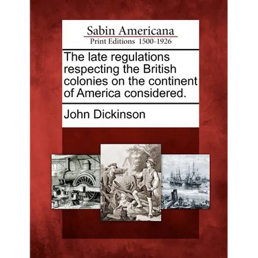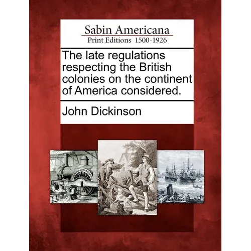 Title: The late regulations respecting the British colonies on the continent of America considered.Author: John DickinsonPublisher: Gale, Sabin Americana Description: Based on Joseph Sabin's famed bibliography, Bibliotheca Americana, Sabin Americana, 1500--1926 contains a collection of books, pamphlets, serials and other works about the Americas, from the time of their discovery to the early 1900s. Sabin Americana is rich in original accounts of discovery and exploration, pioneering and westward expansion, the U.S. Civil War and other military actions, Native Americans, slavery and abolition, religious history and more.Sabin Americana offers an up-close perspective on life in the western hemisphere, encompassing the arrival of the Europeans on the shores of North America in the late 15th century to the first decades of the 20th century. Covering a span of over 400 years in North, Central and South America as well as the Caribbean, this collection highlights the society, politics, religious beliefs, culture, contemporary opinions and momentous events of the time. It provides access to documents from an assortment of genres, sermons, political tracts, newspapers, books, pamphlets, maps, legislation, literature and more.Now for the first time, these high-quality digital scans of original works are available via print-on-demand, making them readily accessible to libraries, students, independent scholars, and readers of all ages.++++The below data was compiled from various identification fields in the bibliographic record of this title. This data is provided as an additional tool in helping to insure edition identification: ++++SourceLibrary: Huntington LibraryDocumentID: SABCP04406900CollectionID: CTRG03-B631PublicationDate: 17650101SourceBibCitation: Selected Americana from Sabin's Dictionary of books relating to AmericaNotes: Attributed to John Dickinson.Collation: 38 p