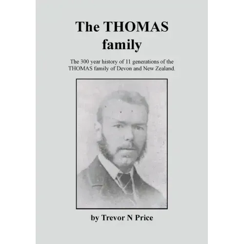 The 300 year history of 11 generations of the THOMAS family of Devon and New Zealand. This family history details the life of brothers John Thomas, George Thomas and John's son John - whom were all born in Devon, England. John Thomas (Snr) came to NZ in 1854. His wife Jane and their children John 4, and William 6 (for whom a separate book is available - see above), and John's brother George arrived soon after. His son John Thomas married Phebe Woods and they had 15 children... 8 of whom went on to marry and raise families. John and family lived at Waterview in Auckland, at Allenton in Ashburton, and retired to live at Coromandel. The main family surnames from John are: Thomas (x8), and older generations include Lowe, Griffiths, Woods, Johns, Cates, Page (x2), Stevens, Segers, Martin, and Brown. John (Snr)'s brother George Thomas married Jane (Polly) Morris and they had 12 children... and 10 married and raised families. George and Polly lived their lives throughout Auckland... in the city area, at Waterview & Avondale. The main family surnames from George are: Thomas (x5), Hill, Harper, Stewart (x3), Bicknell, Morgan, Kimber, Burke, Lewis, Lowe, and Morris. There are many descendants of John and Phebe Thomas and of George and Polly Thomas listed in the Index of Family Trees.