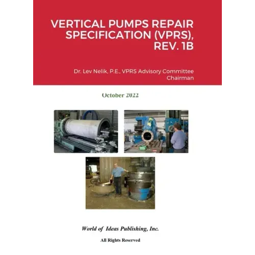 The VPRS Standard brings additional value and benefits provided by other known pump standards, such as those established by Hydraulic Institute, ANSI, API, PIP, and other specifications. Jointly, these provide pump users information beneficial for young engineers entering the industry, as well as for the old-timers who can compare the recommendations presented in this book to their own practices and approaches, thus enhancing the state of the art of pumps repairs and upgrades, reducing cost, and improving equipment reliability. It is written in an easy-to-follow language, a "people-speak" narrative, with practical, real-life examples, and procedures to follow during various repair levels a Repair or Upgrade job shop performs. Also, the Standard kicks off with a real-life story, making it possible for the repair professional to relate to their own problems and challenges and see what other people find in their own experiences. The World of Ideas Publishing, with Vertical Pumps Repair Standard, Chief Editor Dr. Lev Nelik, P.E. Vertical Pumps Repair Standards, Rev. 1B Advisory Committee Chairman Pumping Machinery, LLC www.PumpingMachinery.com DrPump@PumpingMachinery.com October 2022