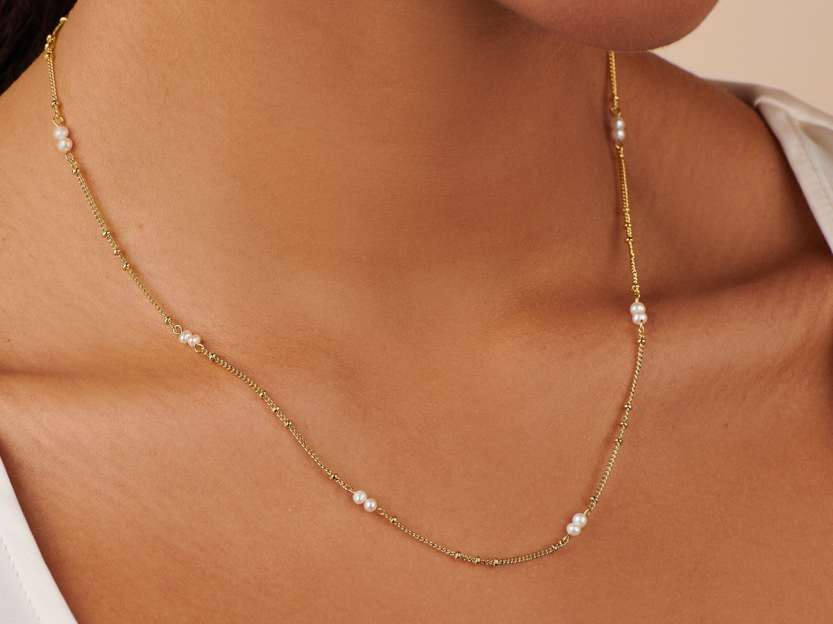 Introducing the epitome of understated elegance: a dainty bead pearl necklace that marries the timeless charm of pearls with the delicate allure of fine gold chain. Each pearl is carefully selected and spaced along the golden strand, creating a symphony of subtle sophistication that dances gracefully upon the neck. Perfect for layering or as a standalone piece, this necklace is a celebration of classic style, making it an essential addition to any jewelry collection.