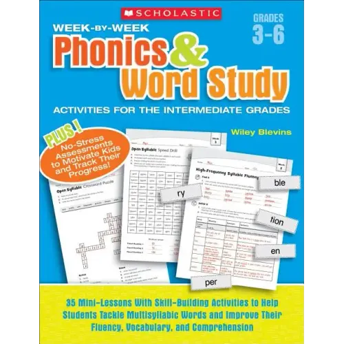 Short, weekly fluency-building activities designed by phonics expert Wiley Blevins! Gives you the tools you need to help struggling readers decode multisyllabic words-and read grade-level texts with confidence. Each activity set includes a mini-lesson that targets multisyllabic words, follow-up practice pages, a speed drill, and a ten at a time activity that helps students master the top 322 syllables!