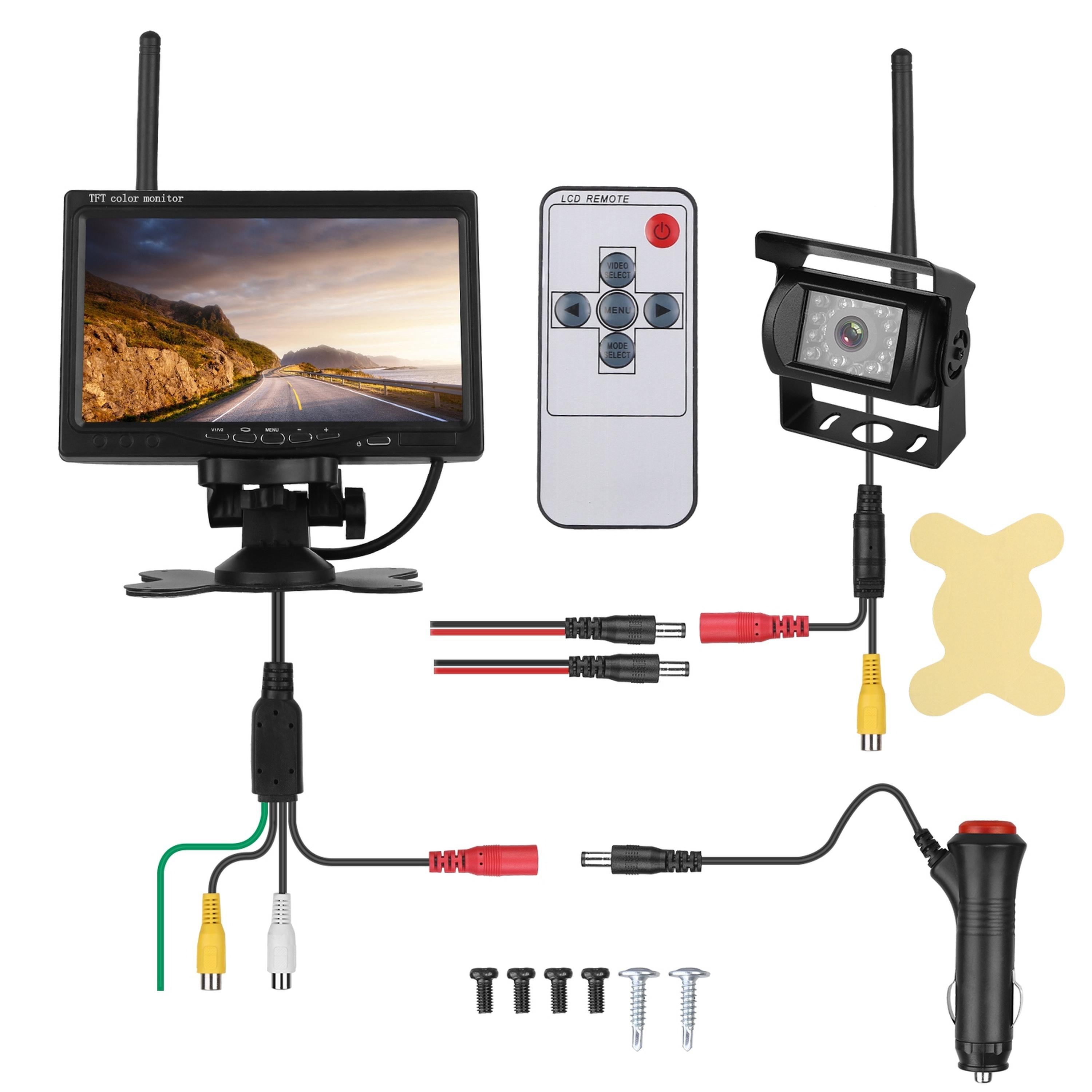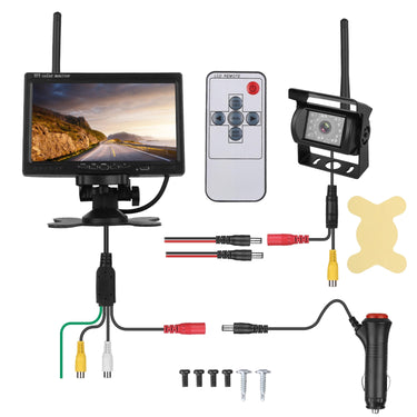 Come with this Wireless Backup Camera with 7in Monitor, can keep you safe and give you much convenience while backing out of the driveway or parking space. After easy installation and wireless connection, the monitor can automatically display rear view image when you reversing to prevent accident to avoid children, pet and more. With IP67 waterproof performance, no need to worry about even driving in rainy day. And night vision function allows you to catch clear image and video at night. Works well with most DC12-35V-power vehicles, such as Trucks, Van, RVs, etc..