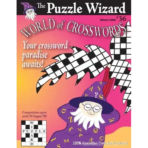 Issue No. 36 (Winter 2008) of the popular World of Crosswords by The Puzzle Wizard. World of Crosswords, first published in 1999, is a quarterly crossword book owned and based in Australia. The aim of the publisher, Greg Parker, is to provide a book of high-quality Australian crosswords at the best possible value. Indeed, each issue to date has included over six-and-a-half thousand clues (in the crosswords alone, not counting the variety of other puzzles). The crosswords, at least eighteen each of giant, large, and quick, are designed to provide a mental stimulus without proving too difficult. The clues cover a variety of different subjects, stretching worldwide and through the ages, all the time retaining an Australian point of view.