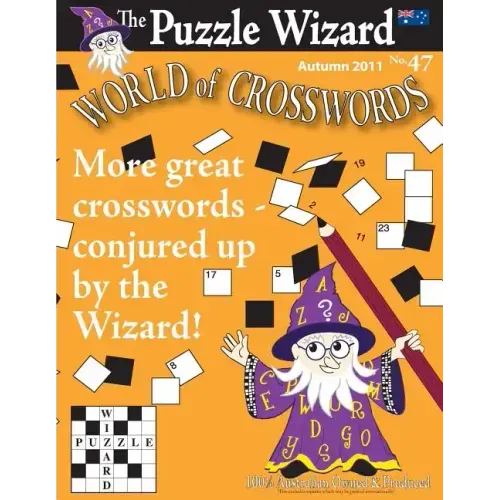 Issue No. 47 (Autumn 2011) of the popular World of Crosswords by The Puzzle Wizard. World of Crosswords, first published in 1999, is a quarterly crossword book owned and based in Australia. The aim of the publisher, Greg Parker, is to provide a book of high-quality Australian crosswords at the best possible value. Indeed, each issue to date has included over six-and-a-half thousand clues (in the crosswords alone, not counting the variety of other puzzles). The crosswords, at least eighteen each of giant, large, and quick, are designed to provide a mental stimulus without proving too difficult. The clues cover a variety of different subjects, stretching worldwide and through the ages, all the time retaining an Australian point of view.