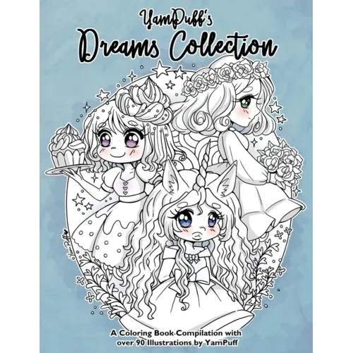YamPuff's Dreams Collection is a whimsical compilation of YamPuff's dream-themed coloring books; Carousel, Sugary and Flowery Dreams It also features as a bonus, for the first time in print, her Galaxy Dreams and Magic Bottle coloring page collections. With over 90 detailed illustrations on large pages (8.5 x 11 inches), the Dreams Collection is a perfect introduction to YamPuff's art and adorable chibis, as well as for long-time fans.